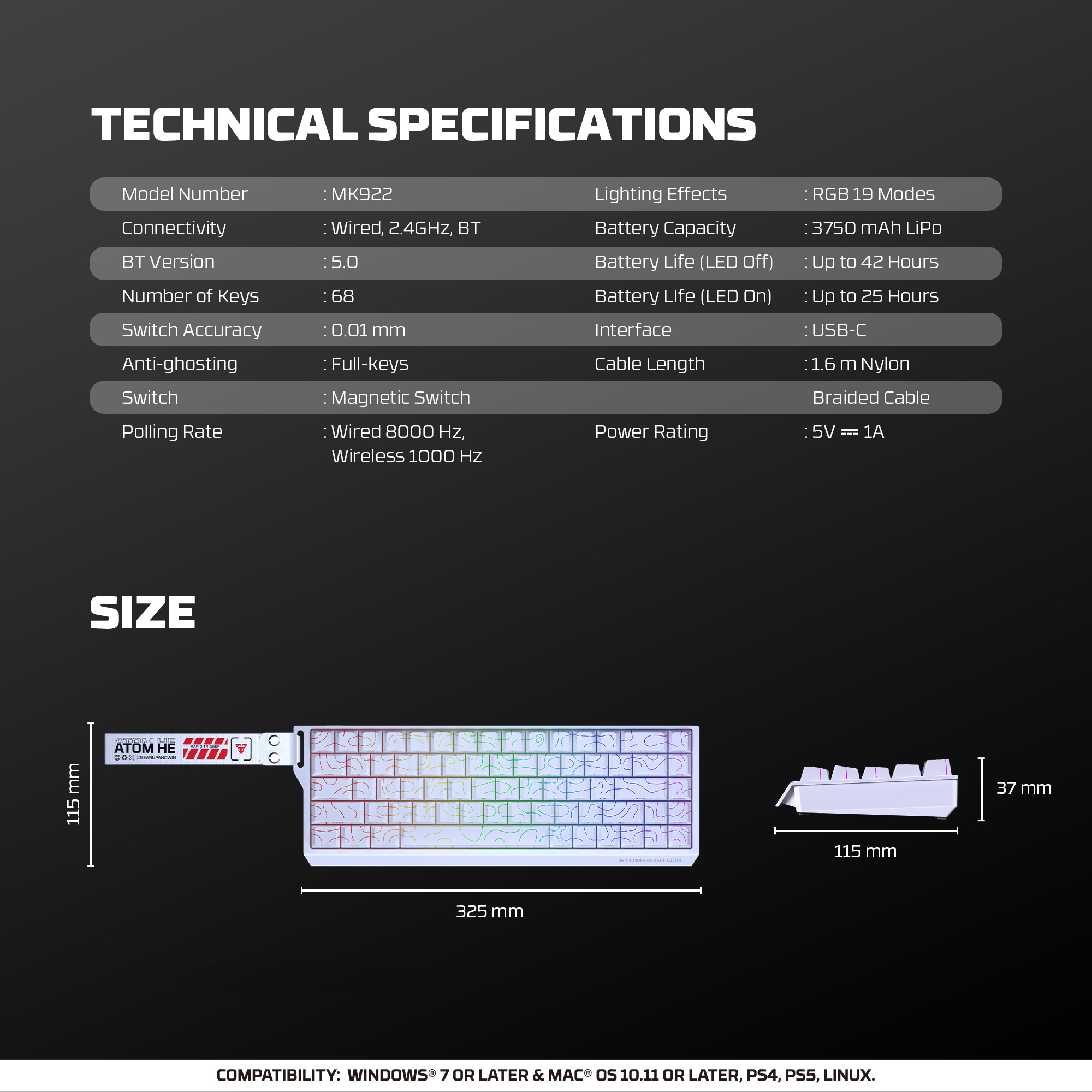 (Note: official manual lists approx. 315 × 119 × 37 mm, slight variation due to design illustration)