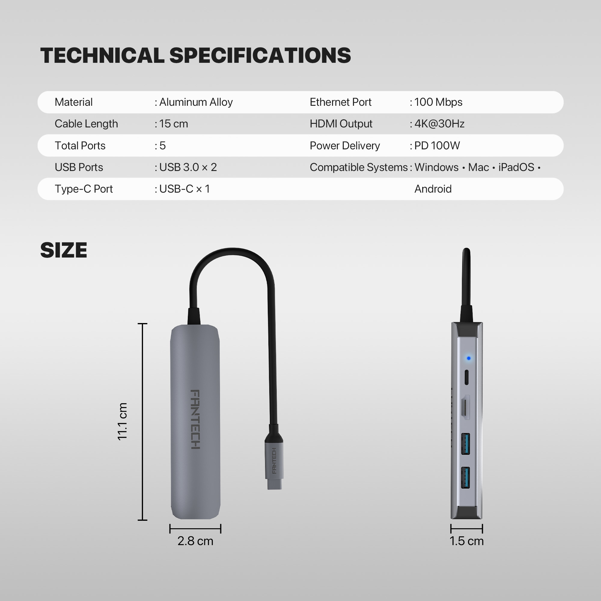 Dimensions: Approximately 11.1 cm (H) x 2.8 cm (W) x 1.5 cm (D) (as shown in the provided image)