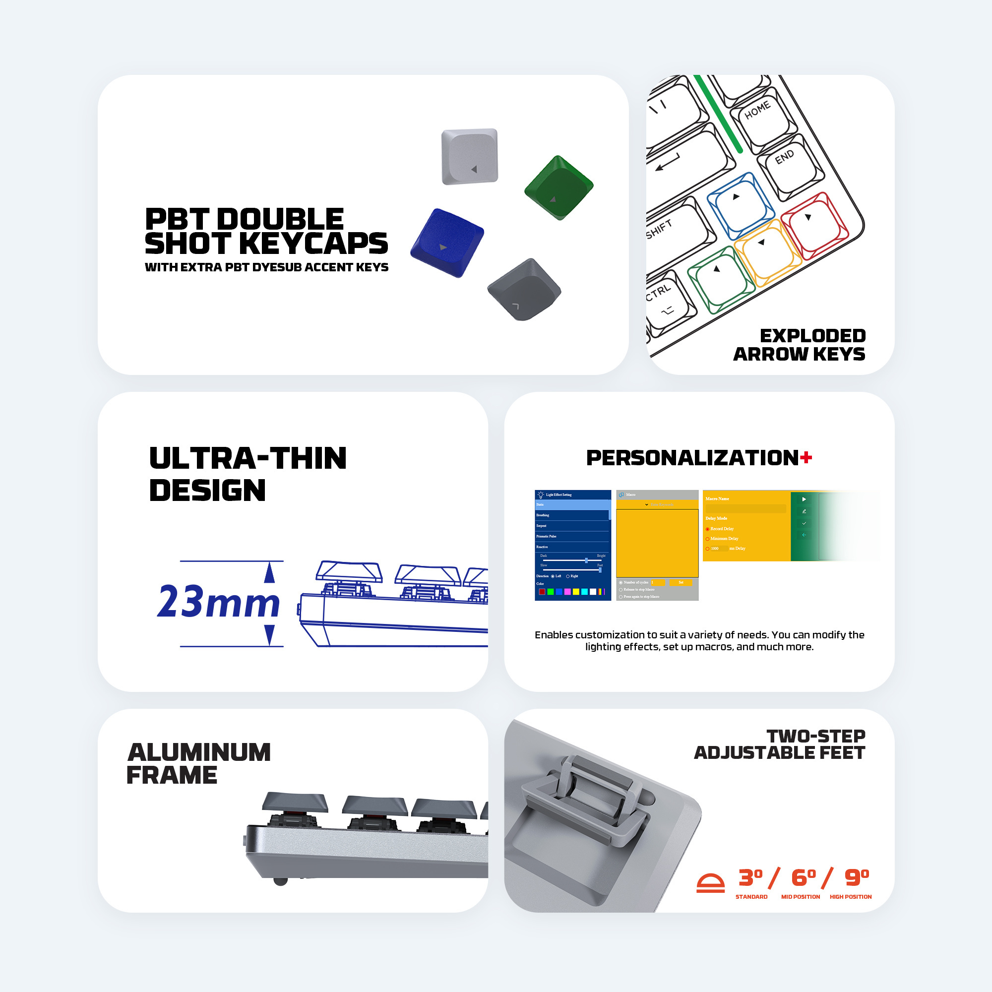 • 95% Layout with exploded arrow keys design: compact yet efficient, this 95% layout features exploded arrow keys, providing a streamlined that retains full functionality while saving desk space.