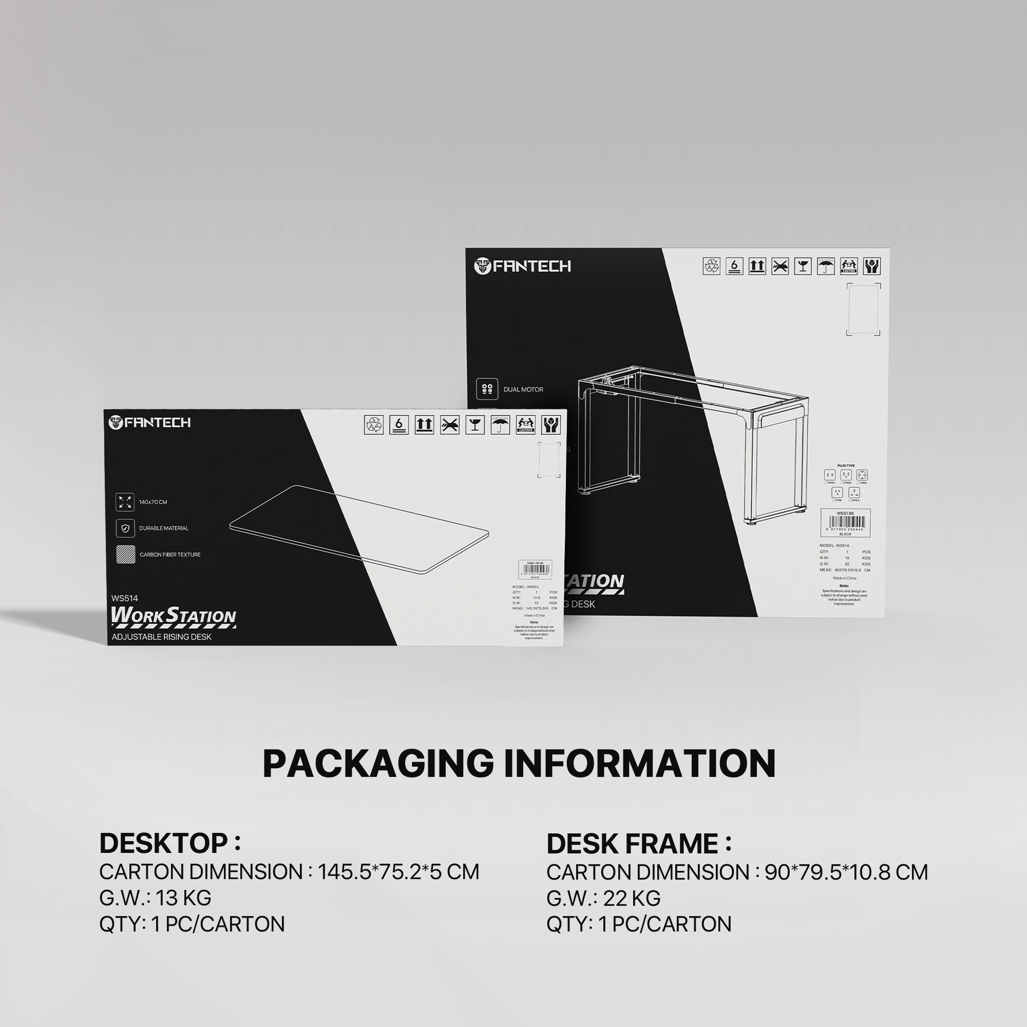 The Fantech WS514 workstation desk is a dual-motor, height-adjustable desk designed for both gaming and work setups. Key specifications include a large 140cm x 70cm surface area, adjustable height range from 74cm to 118cm, and a weight capacity of up to 80kgIt features a sturdy steel frame, a sleek carbon-finish surface, and integrated cable management