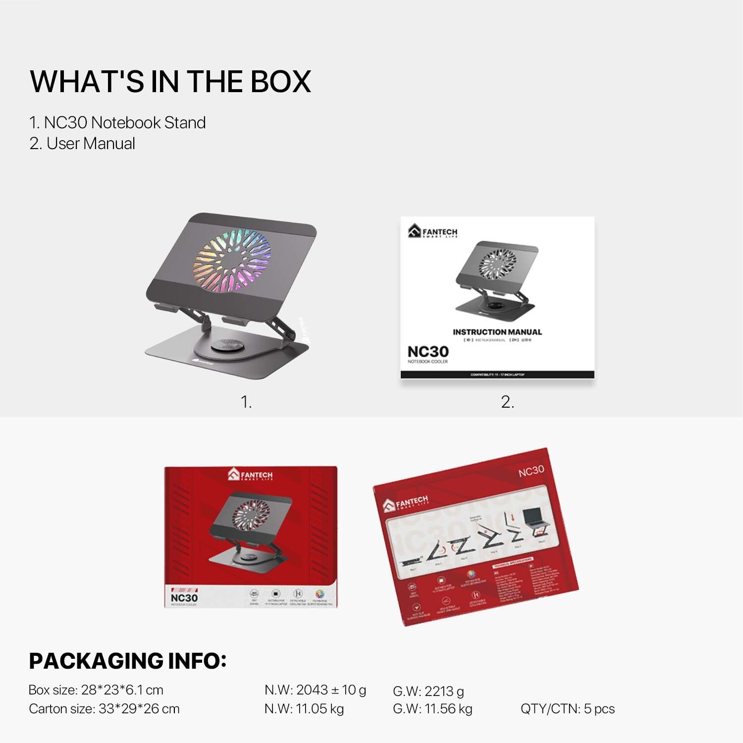* Anti Slip Surface & Base * Adjustable Height * 360• Rotatable * Detachable Cooling Fan * Durable Steel Material * Suitable for 11-17 inch Laptop * 155mm RGB Sleeve Bearing Fan * Sturdy & Spacious * Weight : 1,9 kg