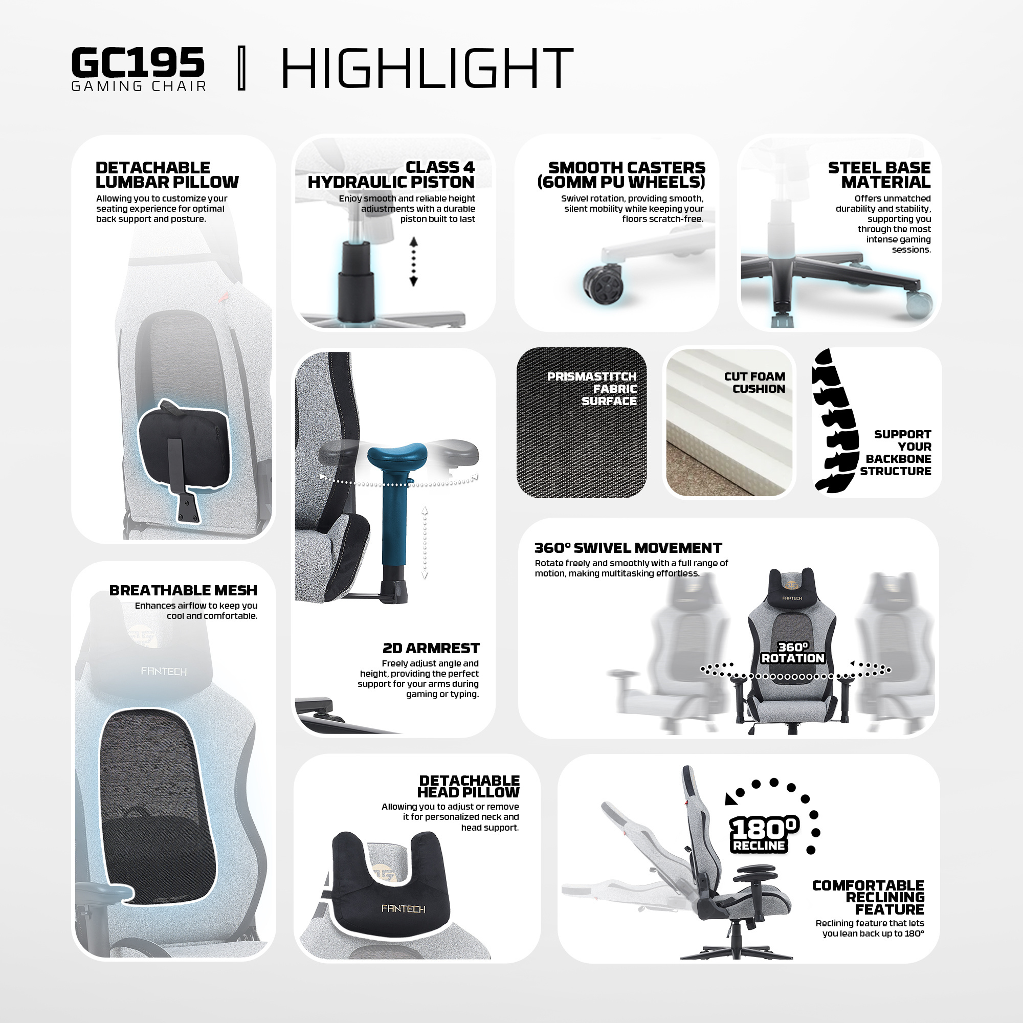 The full specifications and highlights of the Fantech GC195 Gaming Chair: